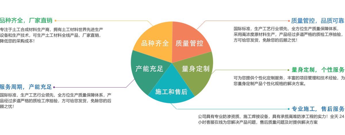 公司所有產(chǎn)品均采用國際標準組織生產(chǎn),并經(jīng)國家、市技術(shù)監(jiān)督局采標驗收,生產(chǎn)工藝及水平全國領先,屬國內(nèi)優(yōu)等水平,實物質(zhì)量達到國際先進水平。經(jīng)用戶、施工單位使用證明,質(zhì)量穩(wěn)定可靠、施工方便、價格合理、售后服務完善。產(chǎn)品主要應用于農(nóng)業(yè)、海綿城市建設、公路、鐵路、垃圾填埋場防滲,水利、電力、水土保持及環(huán)境綠化與基礎建設領域,已被廣泛應用于高速公路、鐵路、垃圾填埋場等多項國家重點工程,受到工程界專家及廣大用戶的一致好評。